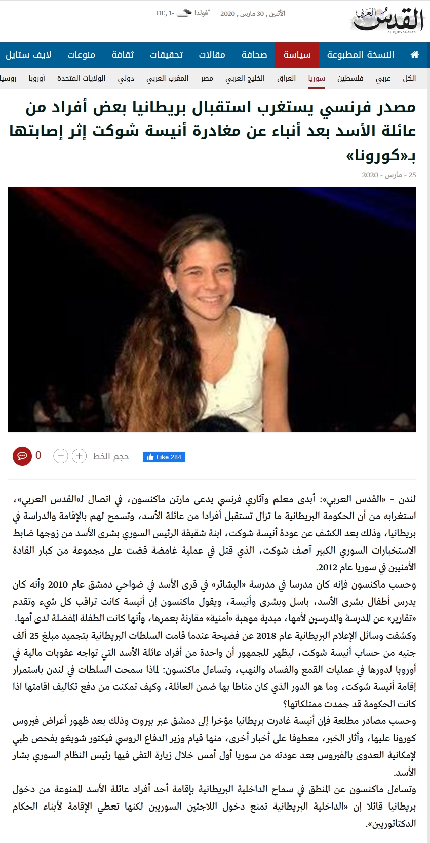 قالت صحيفة القدس العربي، الأربعاء (25/3)، إن معلماً وآثاري فرنسي استغرب استمرار بريطانيا استقبال أفراد من عائلة الأسد، والسماح لهم بالبقاء، مضيفة أن أنيسة شوكت ابنة آصف شوكت وبشرى الأسد ظهرت عليها أعراض الإصابة بفيروس  كورونا.