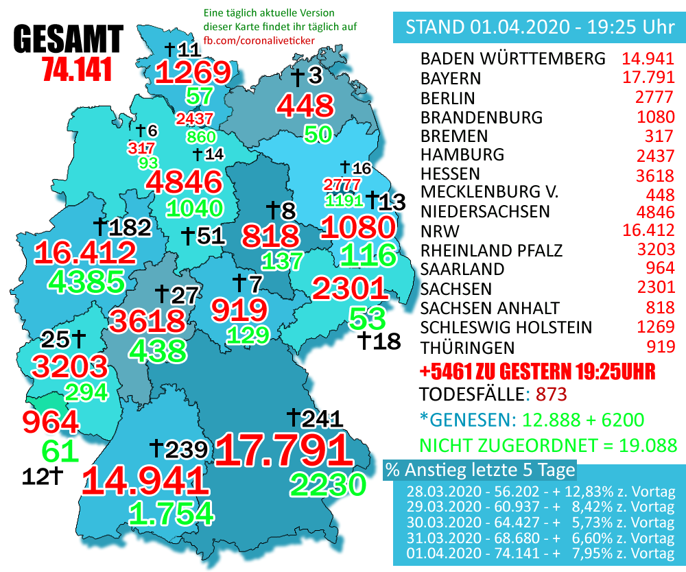 وذكرت مصادر إعلامية ألمانية أن عدد المصابين تجاوز 74141 مصاباً، مع وجود حالات غير مسجلة تصل إلى حوالي 800 حالة.