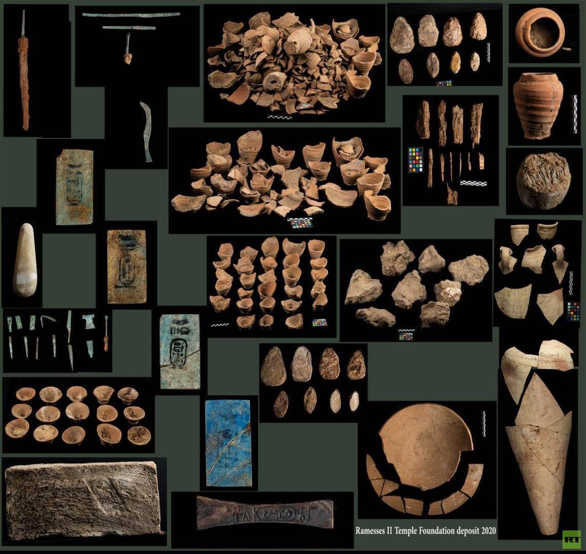 وقال الأمين العام للمجلس الأعلى للآثار في مصر مصطفي وزيري، إن البعثة كشفت في الركن الجنوبي الغربي من المعبد، عن نماذج لألواح منقوش عليها اسم العرش للملك رمسيس الثاني مطلية باللون الأزرق أو الأخضر ونماذج لأدوات البناء وأواني فخارية وقطع أحجار من الكوارتزيت بيضاوية الشكل.