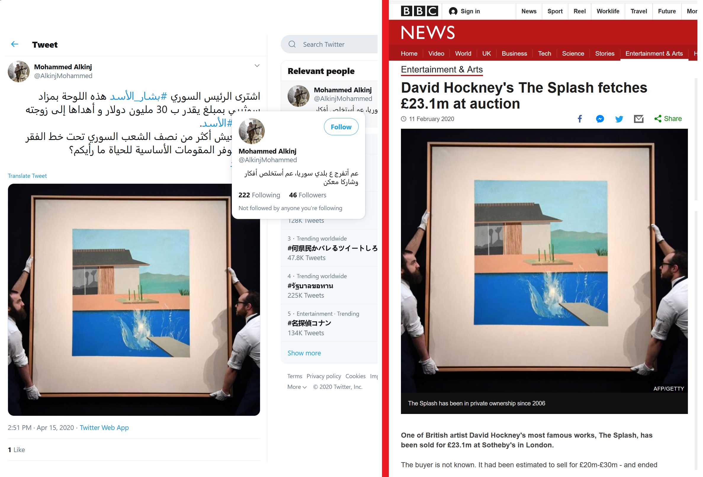 أما عن اللوحة التي يتحدث عنها الخبر المخترع، فهي لوحة لفنان البوب آرت البريطاني الشهير ديفيد هوكني، وقد بيعت مقابل 23,1 مليون جنيه استرليني (29,8 مليون دولار) في مزاد في لندن يوم الثلاثاء 11/2/2020 (أي قبل أكثر من شهرين) لمشتر مجهول الهوية.