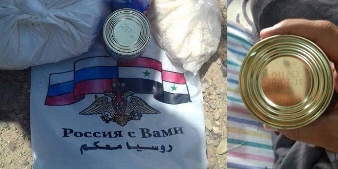 وذكر ناشطو “الرقة تذبح بصمت” الأربعاء أن “دورية عسكرية روسية بتوزيع مواد غذائية منتهية الصلاحية من ضمنها حليب للأطفال على سكان قرية الرحيات شمال الرقة”.