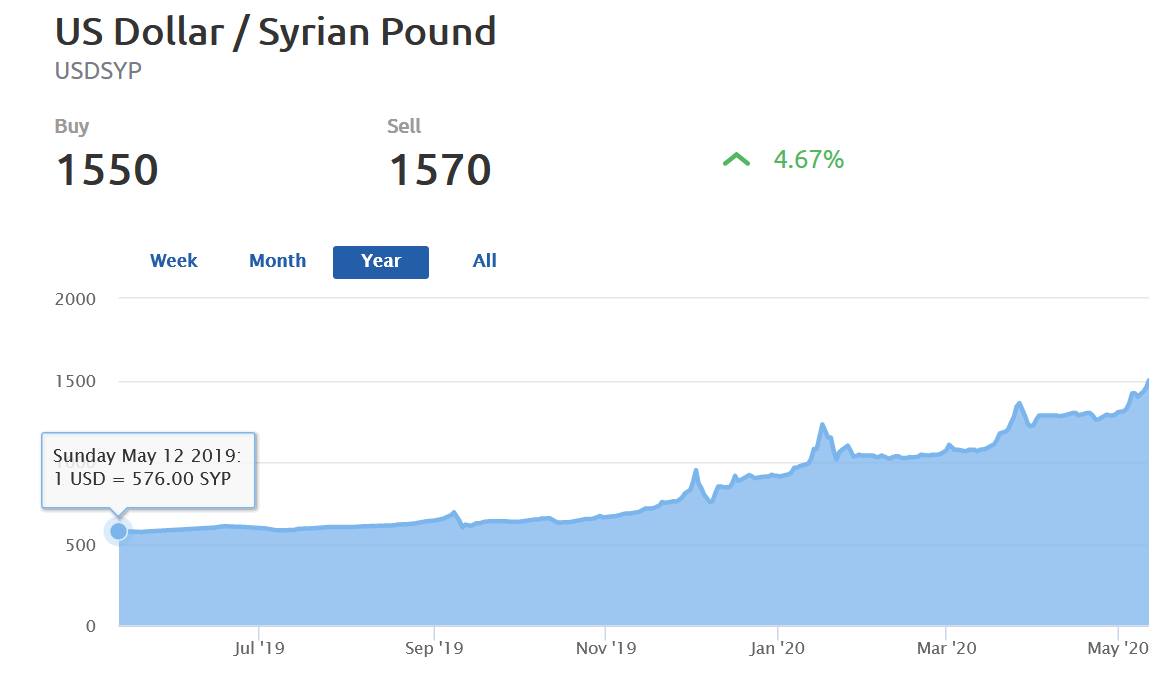 وكان سعر الصرف قبل عام من اليوم (12/5/2019) حوالي 576 ليرة، أي أن التراجع خلال عام مقداره 1000 ليرة تقريباً.