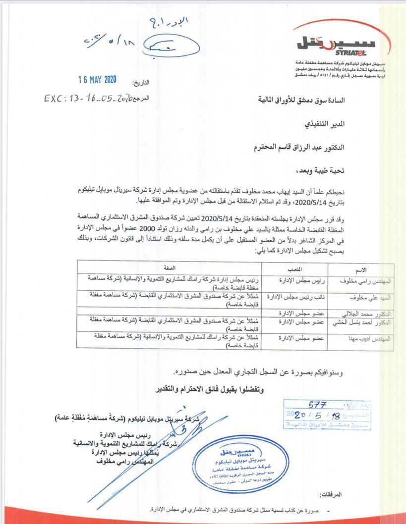 وبحسب البيان الموجه لسوق دمشق للأوراق المالية، فإن إيهاب مخلوف قدم استقالته من عضوية مجلس إدارة شركة “سيريتل”، وتمت الموافقة عليها من قبل مجلس الإدارة، مع تعيين شركة صندوق المشرق الاستثماري، الممثلة بعلي مخلوف ابن رامي، عضواً في مجلس الإدارة في المركز الشاغر بدلاً من العضو المستقيل.
