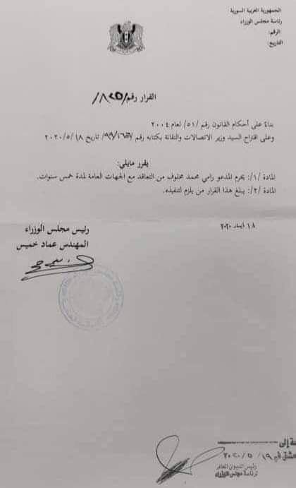 تداولت مصادر إعلامية موالية قراراً حكومياً صدر الثلاثاء، يقضي بحرمان رامي مخلوف من التعاقد مع الجهات العامة لمدة 5 سنوات.