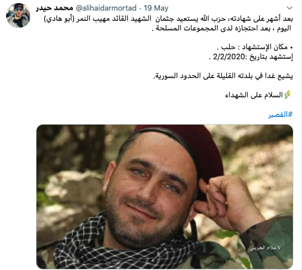 وقالت مصادر موالية إن حزب الله استعاد جثة “الشهيد القائد مهيب النمر”، بعد أن قتل في شباط الماضي في حلب.