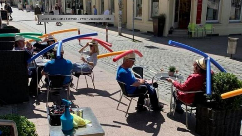 ونشر مقهى روث، الموجود في شفيرين في ولاية مكلنبورغ-فوربومرن، صورة على فيسبوك عند إعادة افتتاحه يظهر فيها زبائنه وهم يرتدون قبعات تحتوي على أنابيب اسفنجية رغوية طويلة كتلك التي تستخدم عادةً في حمامات السباحة. ويبلغ طول هذه الأنابيب 1.5 متر، وتضمن لحاملي القبعات البقاء على مسافة مناسبة من بعضهم البعض.