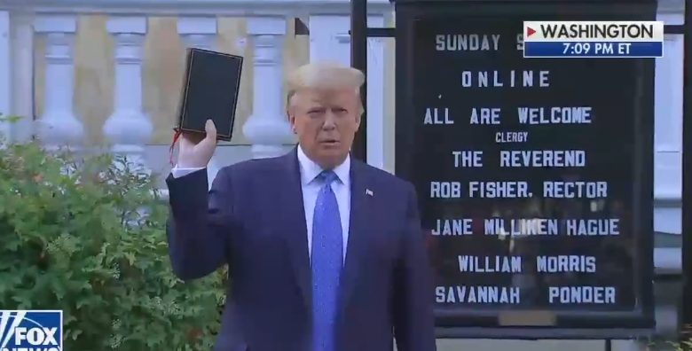 وتوجه ترامب إلى كنيسة مجاورة للبيت الأبيض طالتها أعمال تخريب، وقال وهو يرفع الكتاب المقدس إن الولايات المتحدة، البلد الأعظم في العالم ستظل آمنة. (CNN)