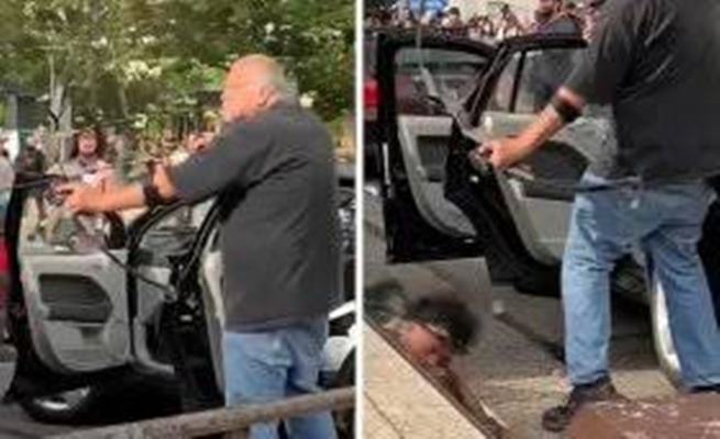 وفي غضون لحظات قليلة تم التعامل معه وطرحه على الأرض من قبل الحشد.