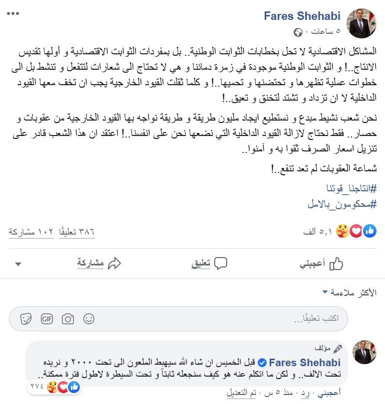 وأضاف: “كلما ثقلت القيود الخارجية يجب أن تخف معها القيود الداخلية لا أن تزداد و تشتد لتخنق و تعيق.. نحن شعب نشيط مبدع و نستطيع إيجاد مليون طريقة وطريقة نواجه بها القيود الخارجية من عقوبات و حصار.. فقط نحتاج لإزالة القيود الداخلية التي نضعها نحن على أنفسنا..! أعتقد أن هذا الشعب قادر على تنزيل أسعار الصرف ثقوا به و آمنوا”.