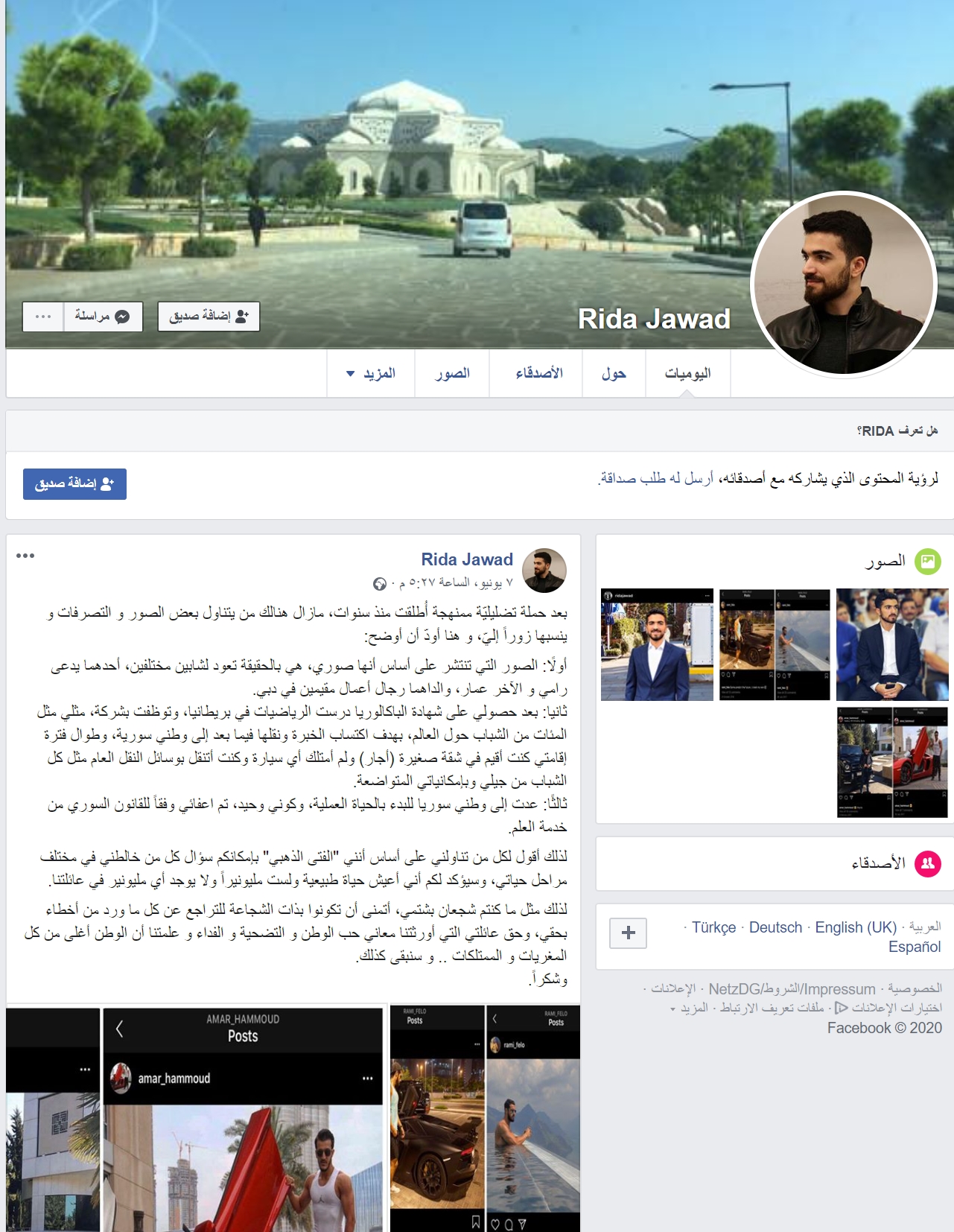 وأشار جواد الذي يضع صورة لقبر حافظ الأسد كغلاف لحسابه في فيسبوك، إلى أنه عاد إلى سوريا بعد انتهاء دراسته وبدأ حياته العملية، وقال إنه ليس الفتى الذهبي كما يصوره البعض، داعياً من وصفهم بالمخطئين بحقه للتراجع عن خطئهم.