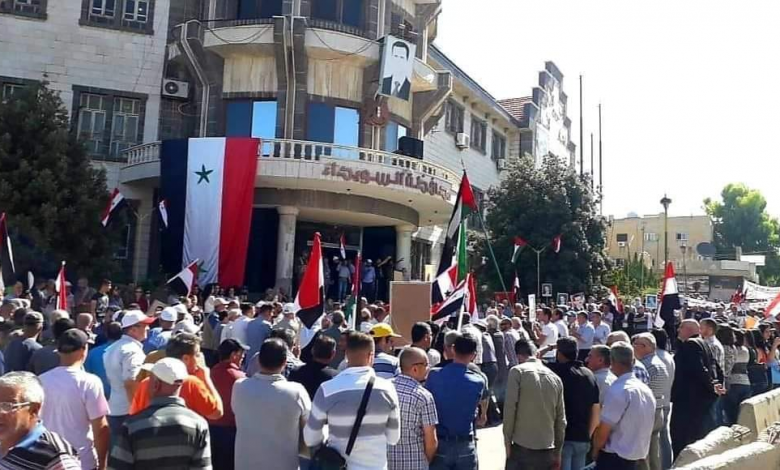 بعد تهديدات بمعاقبة المتخلفين .. سلطات النظام في السويداء تخرج طلاباً و موظفين بمسيرة مؤيدة رداً على المظاهرات التي شتمت بشار الأسد و طالبت بإسقاطه ( فيديو )