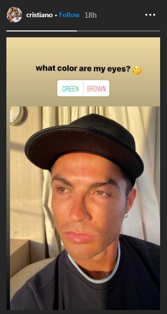 ونشر رونالدو صورة له عبر خاصية “الستوري” في “إنستغرام”، وأرفقها بسؤال لمتابعيه بعيدا عن كرة القدم: “ما هو لون عيني، أخضر أم بني؟”.