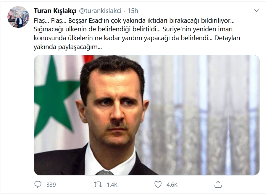 وذكر توران قشلاقجي (كاتب مقالات في صحيفة القدس العربي) الذي قال ناشطون إنه “رئيس بيت الإعلاميين العرب في تركيا” أن “بشار الأسد الأسد سيترك السلطة قريباً جداً، وقيل إن بلد اللجوء تم تحديده أيضاً”.