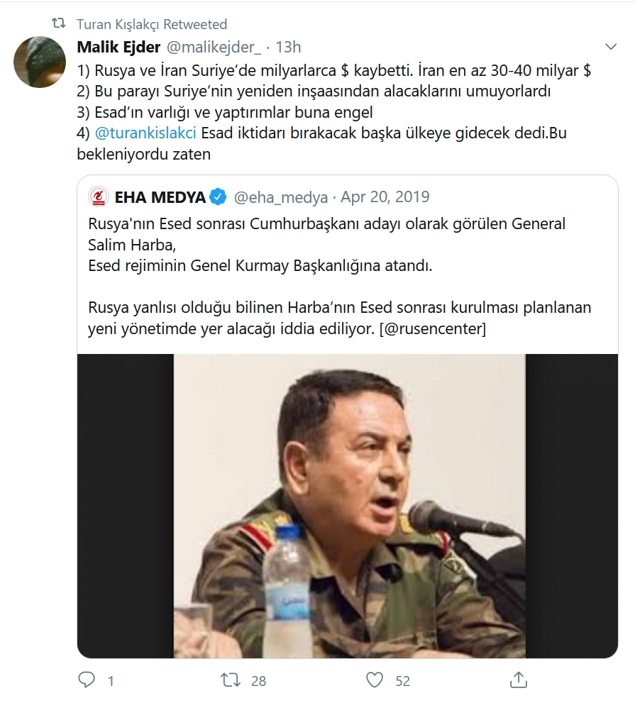 وأعاد قشلاقجي تغريد تغريدة قديمة لمصدر إعلامي تركي ذكر أن مرشح روسيا بعد بشار الأسد هو اللواء سليم حربا رئيس هيئة الأركان (علماً أن حربا هو نائب الرئيس وليس الرئيس).
