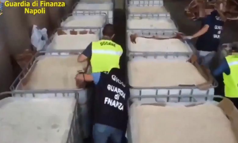 وبحسب التحقيق الذي تشرف عليه نيابة نابولي، كانت المخدرات موجودة في ثلاث حاويات مشبوهة تتضمن لفائف أوراق معدة للاستخدام الصناعي والآلات.