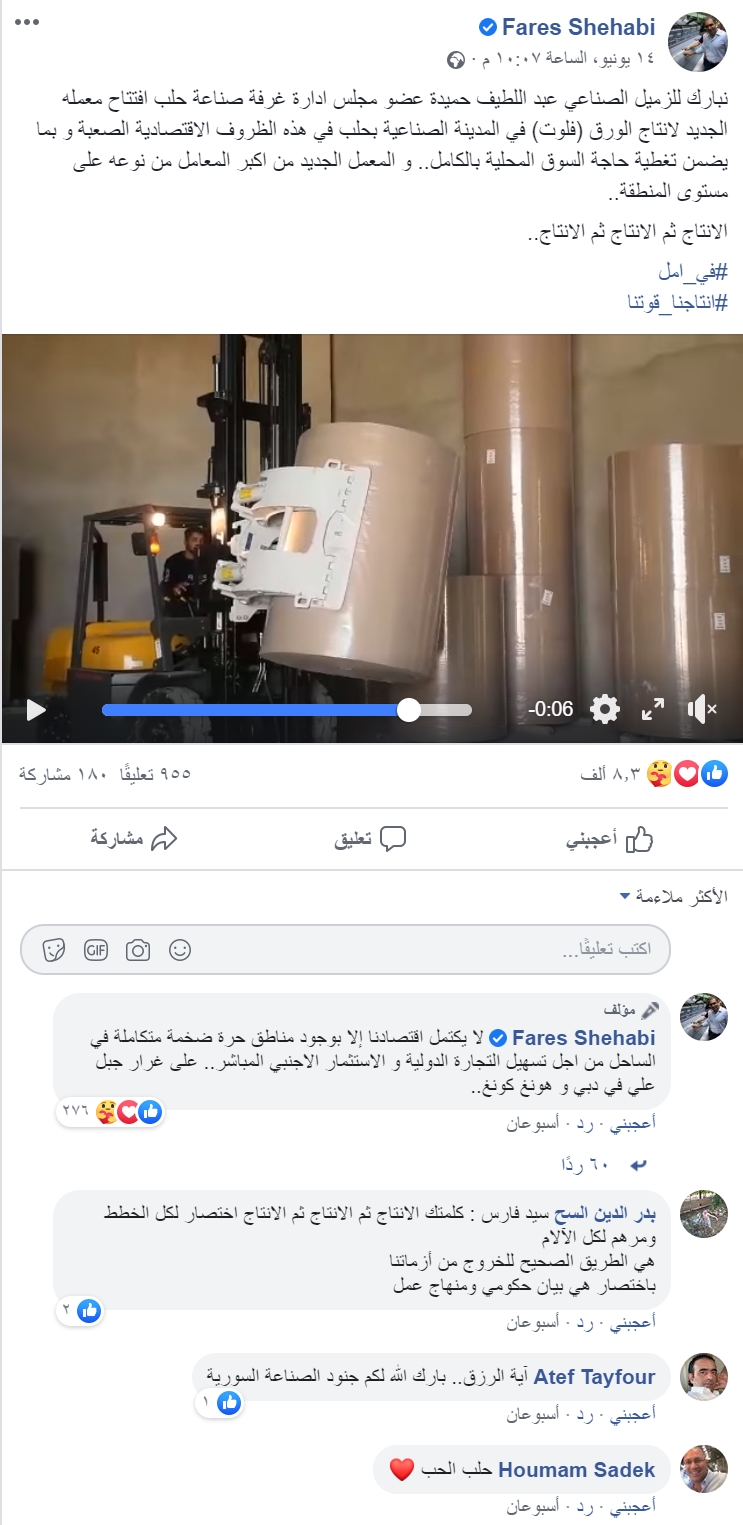 ورصد عكس السير فيديو كان نشره، فارس شهابي، عضو برلمان بشار الأسد، ورئيس اتحاد غرف الصناعة في سوريا، يظهر مباركته لـ “الصناعي عبد اللطيف حميدة عضو مجلس ادارة غرفة صناعة حلب افتتاح معمله الجديد لانتاج الورق (فلوت) في المدينة الصناعية بحلب في هذه الظروف الاقتصادية الصعبة وبما يضمن تغطية حاجة السوق المحلية بالكامل، والمعمل الجديد من أكبر المعامل من نوعه على مستوى المنطقة”.