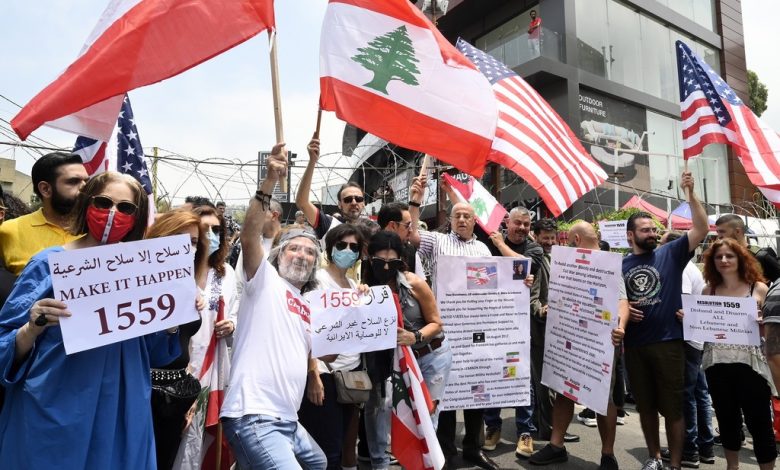 لبنانيون يتظاهرون أمام السفارة الأمريكة في بيروت و يطالبون بنزع سلاح حزب الله