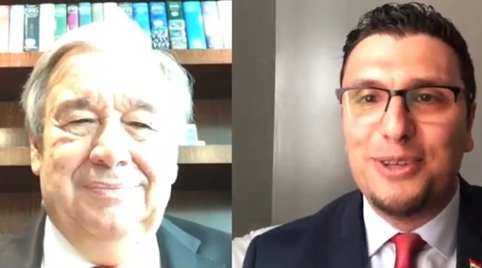 بدأ مشواره بغسل الصحون .. مكالمة فيديو بين الأمين العام للأمم المتحدة و طبيب سوري وصل إلى أمريكا كلاجئ ( فيديو )