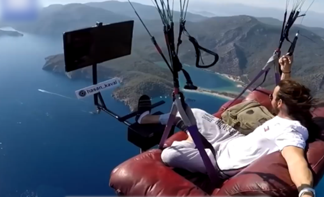 كافال ربط مظلته بمقعد وشاشة تلفزيون، ليقفز بمساعدة صديقه في سماء البحر الميت الواقع في منطقة “فتحية” بولاية موغلا، وأظهر مقطع الفيديو استمتاع المظلي وهو يشاهد أفلام الرسوم المتحركة من السماء.