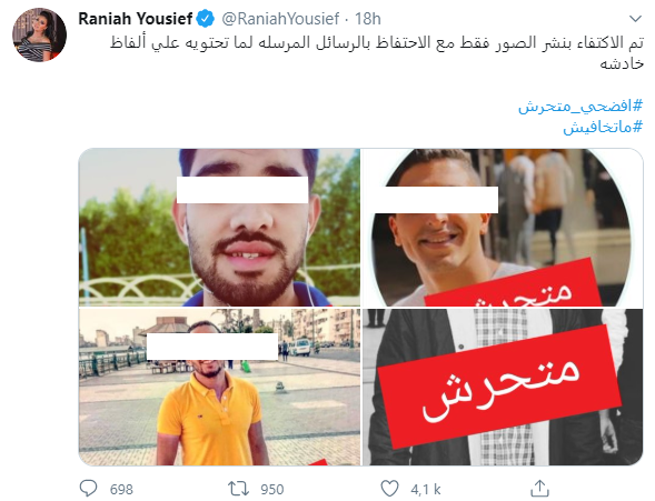 نشرت الفنانة المصرية رانيا يوسف عبر صفحتها الشخصية في موقع التواصل الاجتماعي “تويتر”، صورا لبعض الشباب الذين قالت إنهم تحرشوا بها.