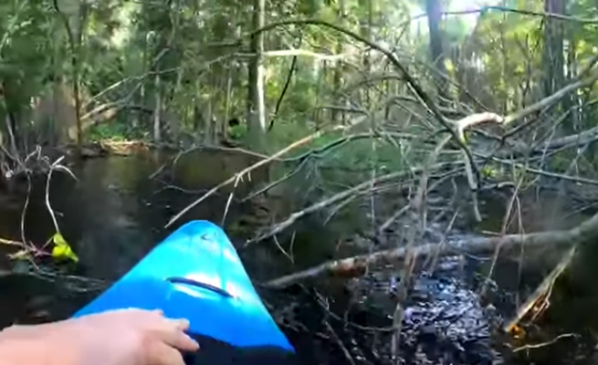 لقطات الحادث المرعب: حيث تُظهر اللقطات المُسجلة جويس وهو يُجدّف في النهر المغطى بالأشجار، في حين كان التمساح يتربّص به فوق سطح الماء إلى يساره.