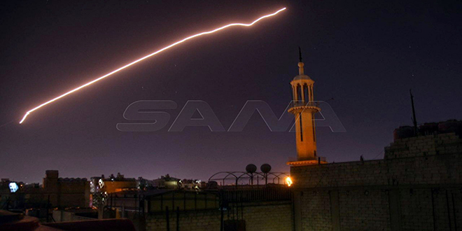 ونقلت عن مصدر عسكري قوله: “في تمام الساعة 21.48 من مساء اليوم وجه طيران العدو الإسرائيلي من فوق الجولان السوري المحتل عدة رشقات من الصواريخ باتجاه جنوب دمشق وقد تصدت لها وسائط دفاعنا الجوي وأسقطت أغلبيتها وأدى العدوان إلى إصابة سبعة جنود بجروح وأضرار مادية”.