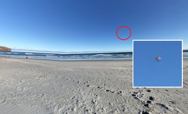ويبدو الجسم الطائر المجهول، معلقا في الهواء فوق شاطئ “سانت كيلدا” في الجزيرة الجنوبية لنيوزيلندا، في صورة غوغل بزاوية 360 درجة.