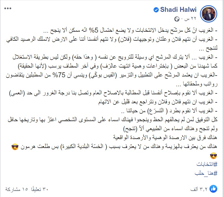 وتابع حلوة: “الغريب ان يعتمد المرشّح على التطبيل والتزمير (الفيس بوكّي) وينسى أن 75% من المطبلين يتقاضون رواتب وملحقاتها … الغريب ألا نقوم بإصلاح أنفسنا قبل المطالبة بالاصلاح العام وتصل بنا درجة الغرور الى حد (العمى) الغريب ان نتهم فلان وفلان ونتراجع بعد قليل عن الاتهام، الغريب ألا نقوم بطرد ( التسرّع) من حياتنا”.