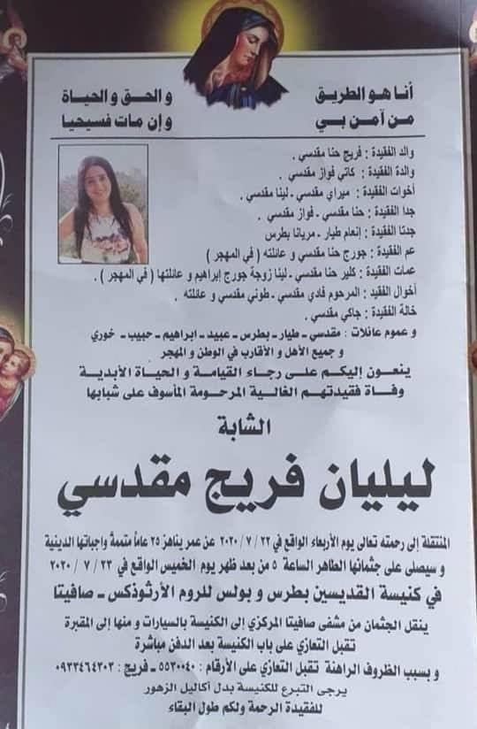 وذكرت المصادر الموالية أن الشابة ليليان فريج مقدسي (25 عاماً) من منطقة صافيتا، توفيت إثر صدمة أدت إلى توقف قلبها.