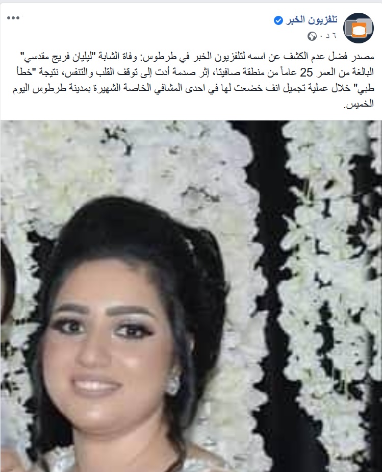وسائل إعلام موالية : وفاة شابة سورية جراء ” خطأ طبي خلال عملية تجميل “