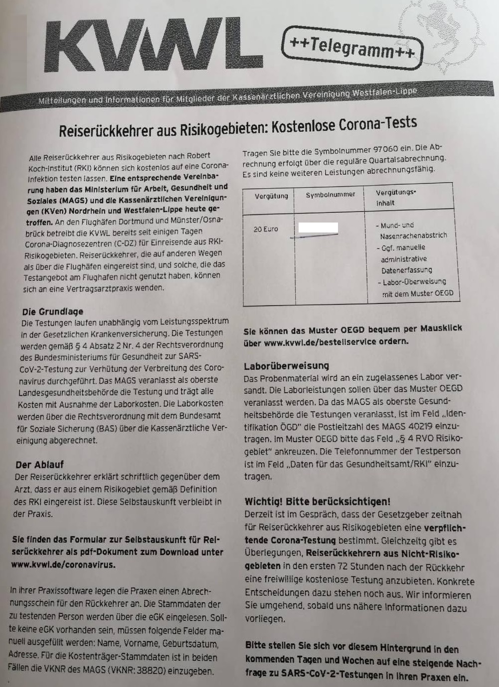 واليوم الثلاثاء أصدرت السلطات قراراً يسمح للعائدين بإجراء الاختبار في عيادة طبيب العائلة أيضاً، وأكد طبيب في ولاية شمال الراين لعكس السير ذلك، وأشار إلى أن التكلفة وفقاً لنص القرار هي 20 يورو فقط.
