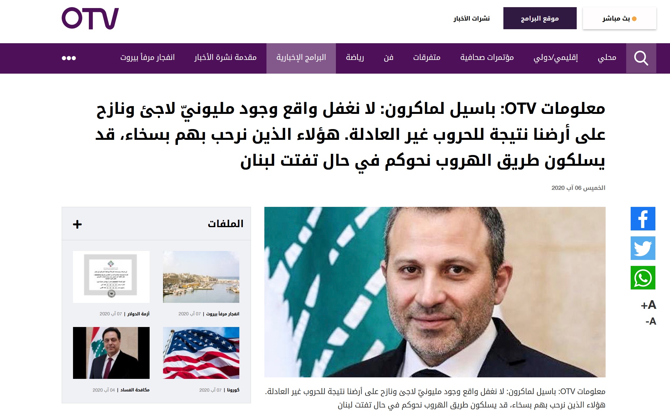 وقالت قناة “أو تي في” اللبنانية، إن باسيل قال لماكرون “لا نغفل واقع وجود مليوني لاجئ ونازح على أرضنا نتيجة للحروب غير العادلة”.