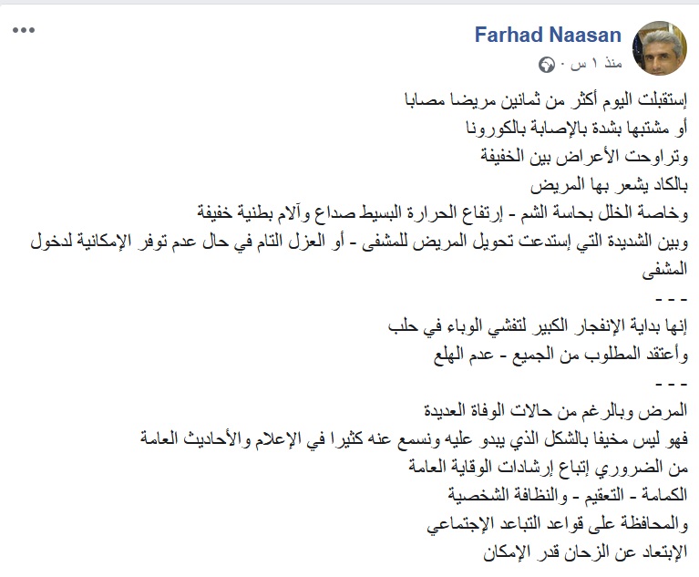 وقال الطبيب فرهاد نعسان، في منشور عبر حسابه بفيسبوك، مساء الأحد، إنه استقبل اليوم “أكثر من ثمانين مريضا مصابا أو مشتبها بشدة بالإصابة بالكورونا وتراوحت الأعراض بين الخفيفة بالكاد يشعر بها المريض وخاصة الخلل بحاسة الشم – إرتفاع الحرارة البسيط صداع وآلام بطنية خفيفة وبين الشديدة التي إستدعت تحويل المريض للمشفى – أو العزل التام في حال عدم توفر الإمكانية لدخول المشفى”.
