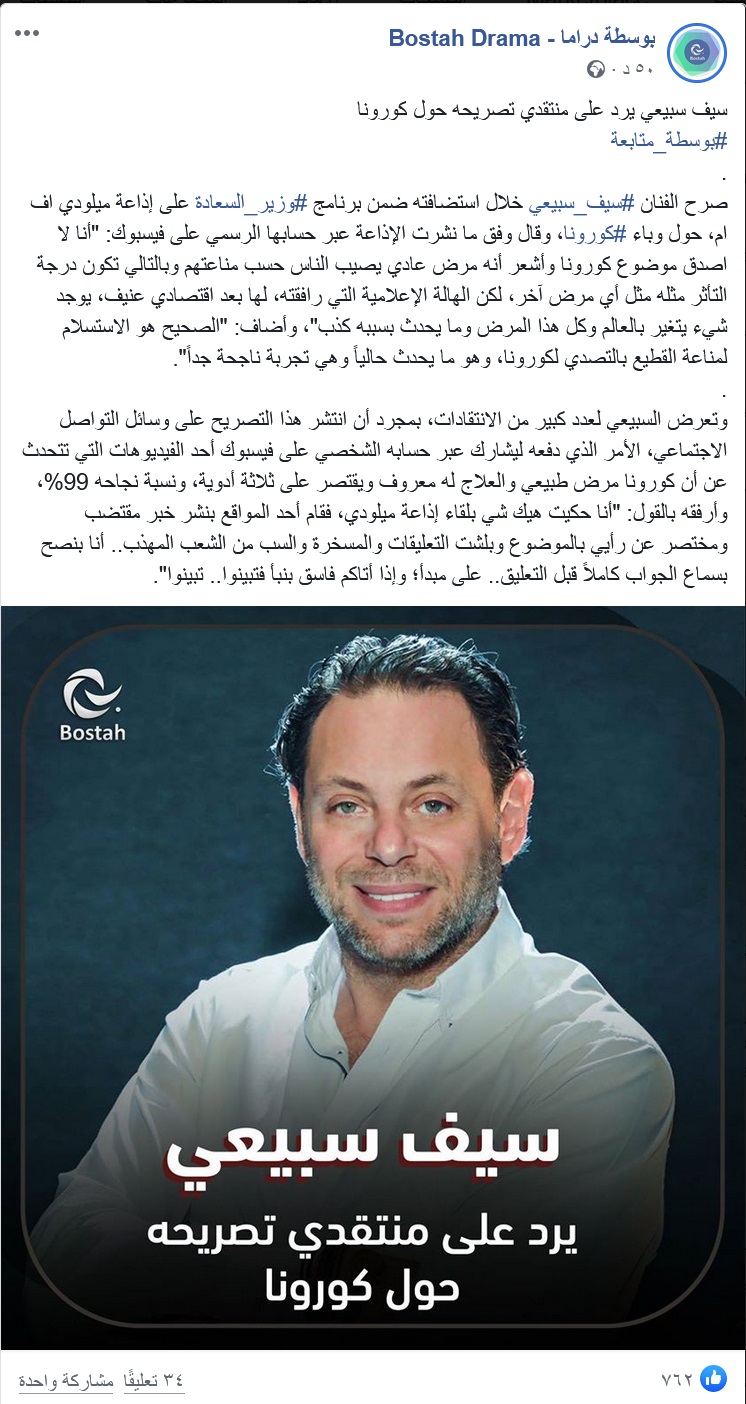 وتعرض سبيعي لانتقادات وقوبل تصريحه بسخرية عبر فيسبوك، ما دفعه للدفاع عنه ونشر فيديو لطبيبة تتحدث عن علاج لكورونا وعن نسبة نجاحه شبه التامة.