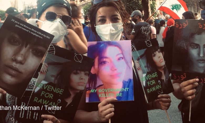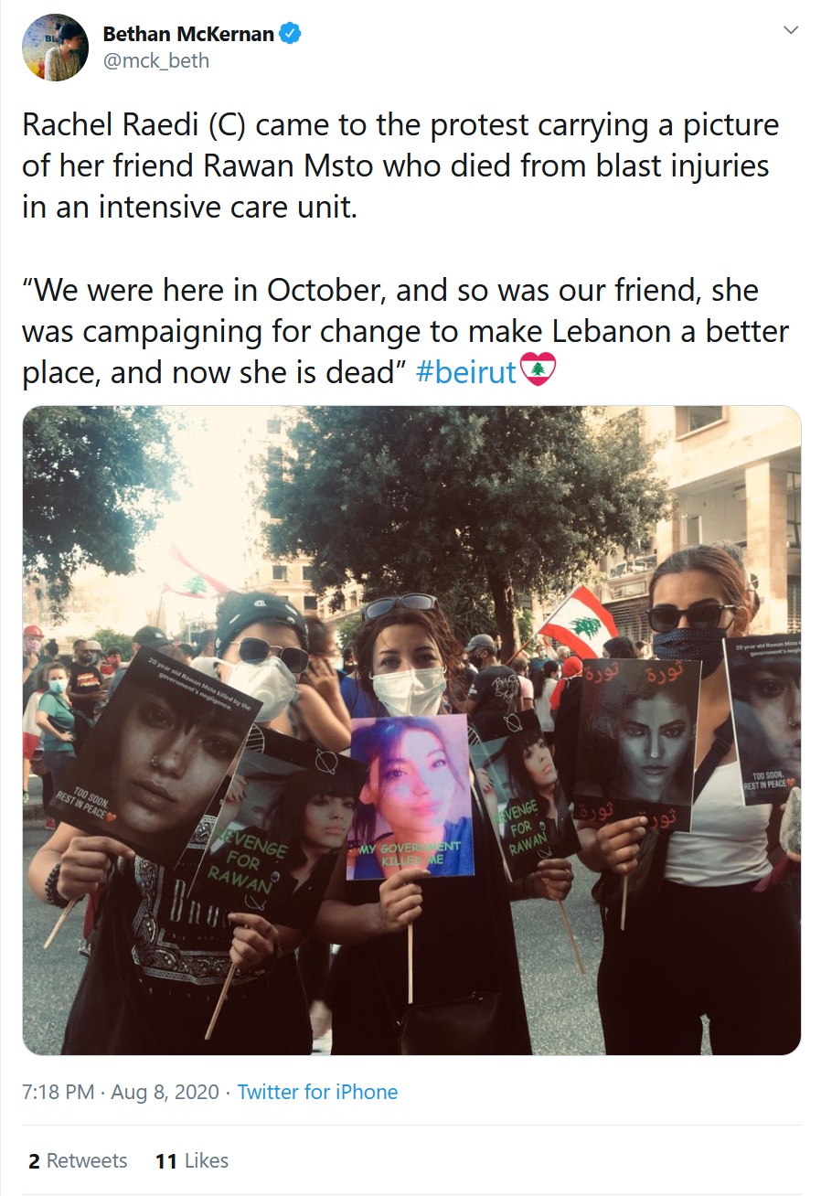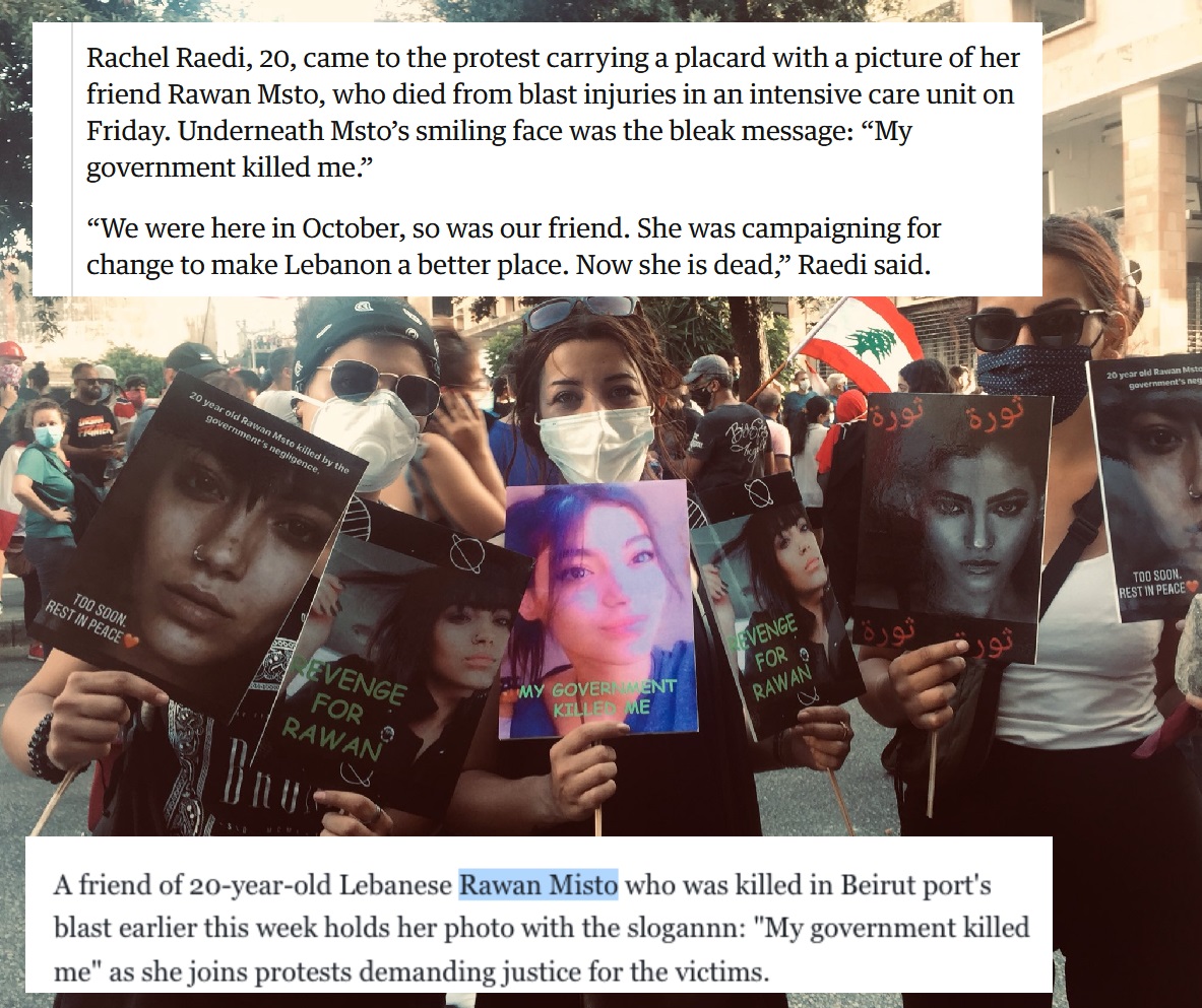 وفي مادة لفرانس برس نشرت يوم أمس، أكدت الوكالة أن روان لبنانية بالقول تعليقاً على الصورة ذاتها: “صديقة للبنانية روان مستو التي تبلغ من العمر 20 عاماً والتي قضت جراء انفجار بيروت، تحمل صورتها التي كتب عليها (حكومتي قتلتني)”.