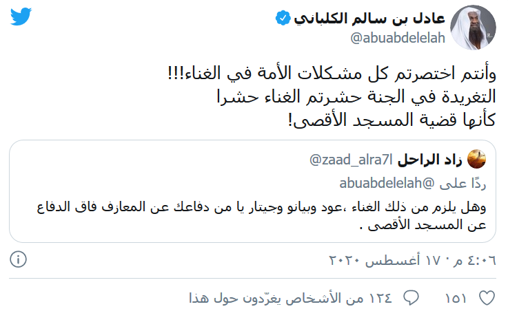 فرد عليه الكلباني: “نكاح الزوجات حلال في الدنيا.. وش رايك؟”، وأضاف: “أنتم اختصرتم كل مشكلات الأمة في الغناء.. التغريدة في الجنة حشرتم الغناء حشرا كأنها قضية المسجد الأقصى”.