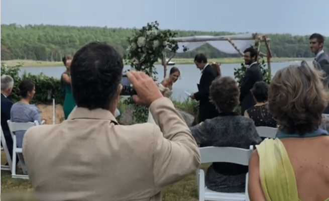 ونشر قريب العريس، آرون ساويتسكي، مقطع فيديو للواقعة الغريبة، حيث ظهر الأخير وهو يلقي خطابا أمام زوجته دنيس خلال مراسم الزفاف.