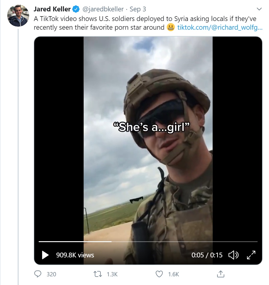A TikTok video shows U.S. soldiers deployed to Syria asking locals if they’ve recently seen their favorite porn star around 😬 https://t.co/skooW15oF1 pic.twitter.com/5DM8ijucaK