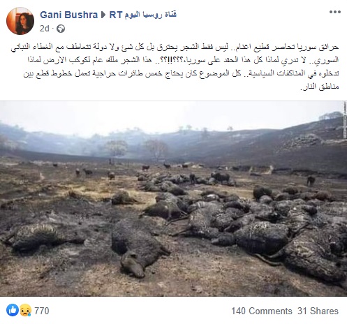 يظهر في الصورة عددٌ من الأغنام المتفحّمة على أرضٍ محروقة، وقد جاء في النصّ المرافق “حرائق سوريا تحاصر قطيع اغنام.. ليس فقط الشجر يحترق بل كل شئ ولا دولة تتعاطف مع الغطاء النباتي السوري..”.