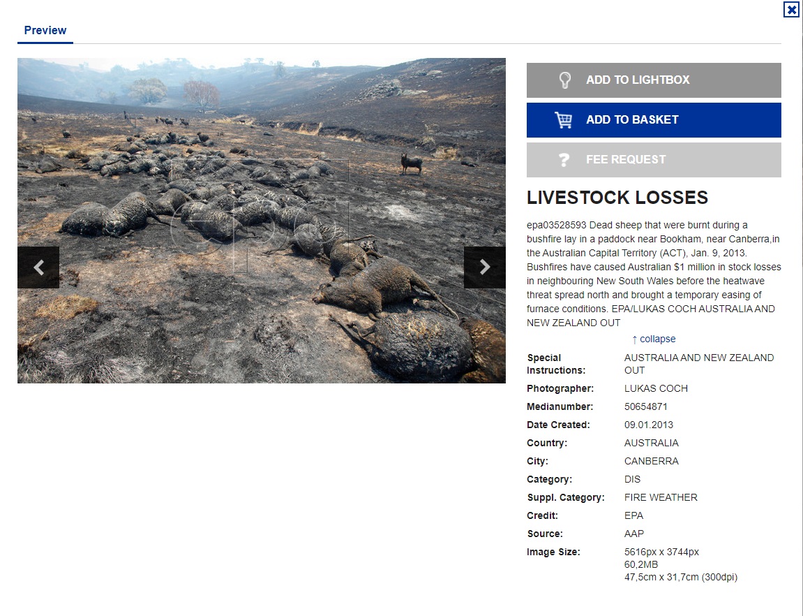 وبالتفتيش عن اسم المصوّر والتاريخ يمكن العثور على النسخة الأصليّة من الصورة، وقد التقطها مصوّر وكالة EPA في أستراليا بتاريخ التاسع من كانون الأول/يناير 2013 وتظهر أغناماً نافقة جراء حرائق قرب العاصمة كانبيرا.