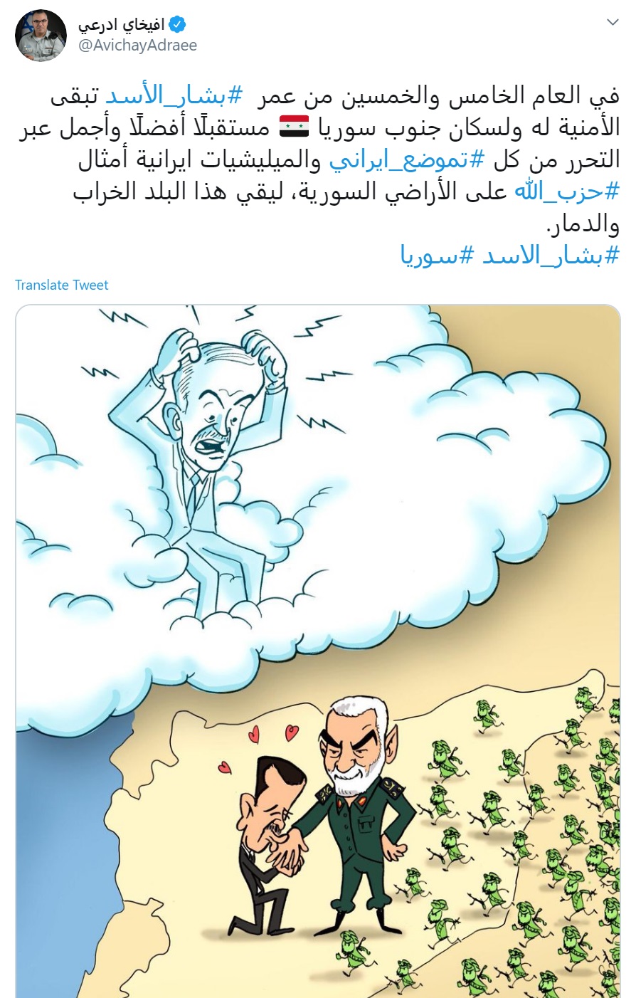 وأرفق أدرعي تغريدته بكاريكاتير يظهر حافظ الأسد غير راض على تبعية ابنه بشار للإيرانيين.