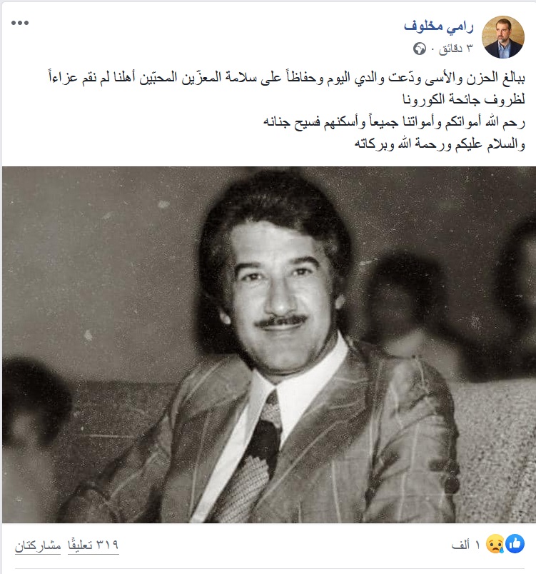 وقال مخلوف: “ببالغ الحزن والأسى ودّعت والدي اليوم وحفاظاً على سلامة المعزّين المحبّين أهلنا لم نقم عزاءاً لظروف جائحة الكورونا”.