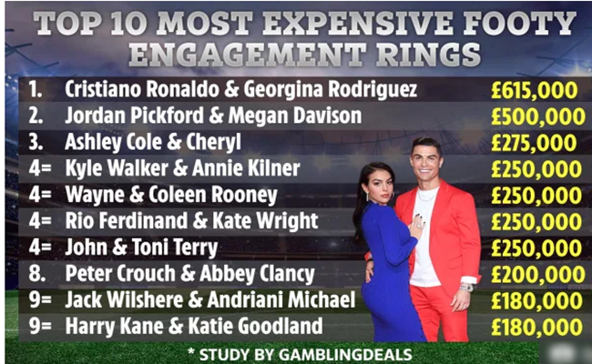 1- خاتم كريستيانو رونالدو لجورجينا رودريغيز – 615 ألف جنيه إسترليني.