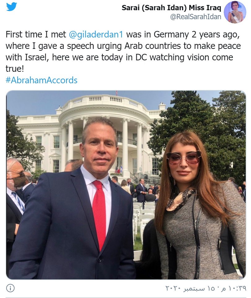 ملكة جمال العراق بصحبة رئيس الموساد في حفل توقيع اتفاقات التطبيع بالبيت الأبيض ( صور )