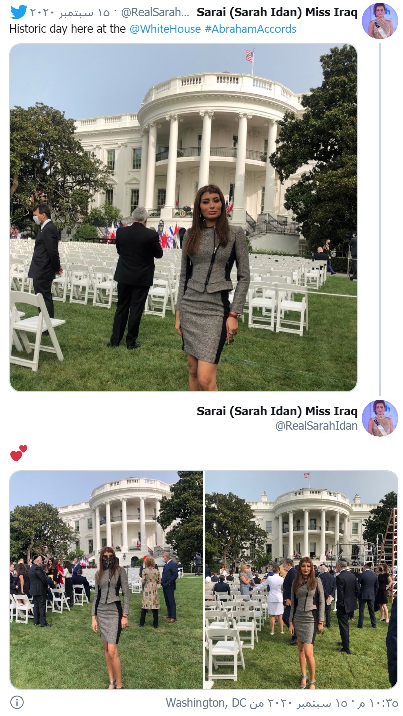 نشرت وسائل إعلام إسرائيلية اليوم الأربعاء صور لملكة جمال العراق سارة عيدان، قالت إنها التقطت خلال توقيع اتفاقات التطبيع في البيت الأبيض بين الإمارات والبحرين، وإسرائيل.