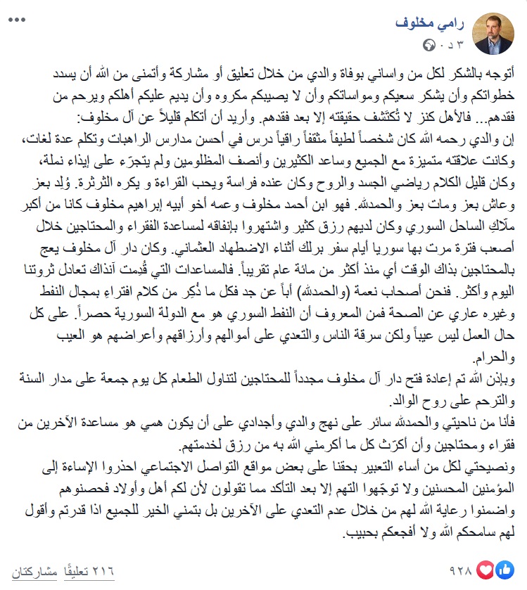 وقال مخلوف: “أتوجه بالشكر لكل من واساني بوفاة والدي من خلال تعليق أو مشاركة وأتمنى من الله أن يسدد خطواتكم وأن يشكر سعيكم ومواساتكم وأن لا يصيبكم مكروه وأن يديم عليكم أهلكم ويرحم من فقدهم… فالأهل كنز لا تُكتَشف حقيقته إلا بعد فقدهم. وأريد أن أتكلم قليلاً عن آل مخلوف”.