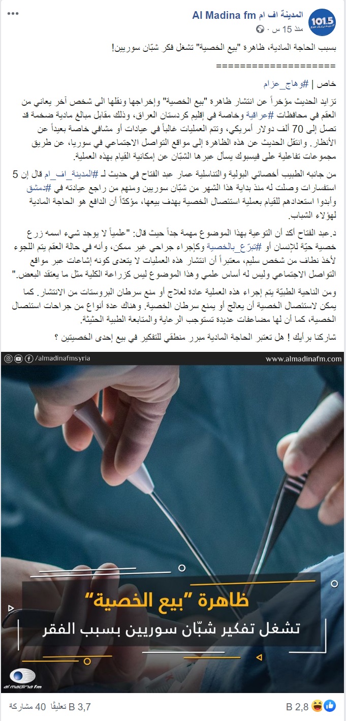 ونقلت عن طبيب (أخصائي بولية وتناسلية) قوله إن 5 استفسارات وصلت له منذ بداية هذا الشهر من شبّان سوريين ومنهم من راجع عيادته في دمشق وأبدوا استعدادهم للقيام بعملية استئصال الخصية بهدف بيعها، مؤكداً أن الدافع هو الحاجة المادية لهؤلاء الشبان.