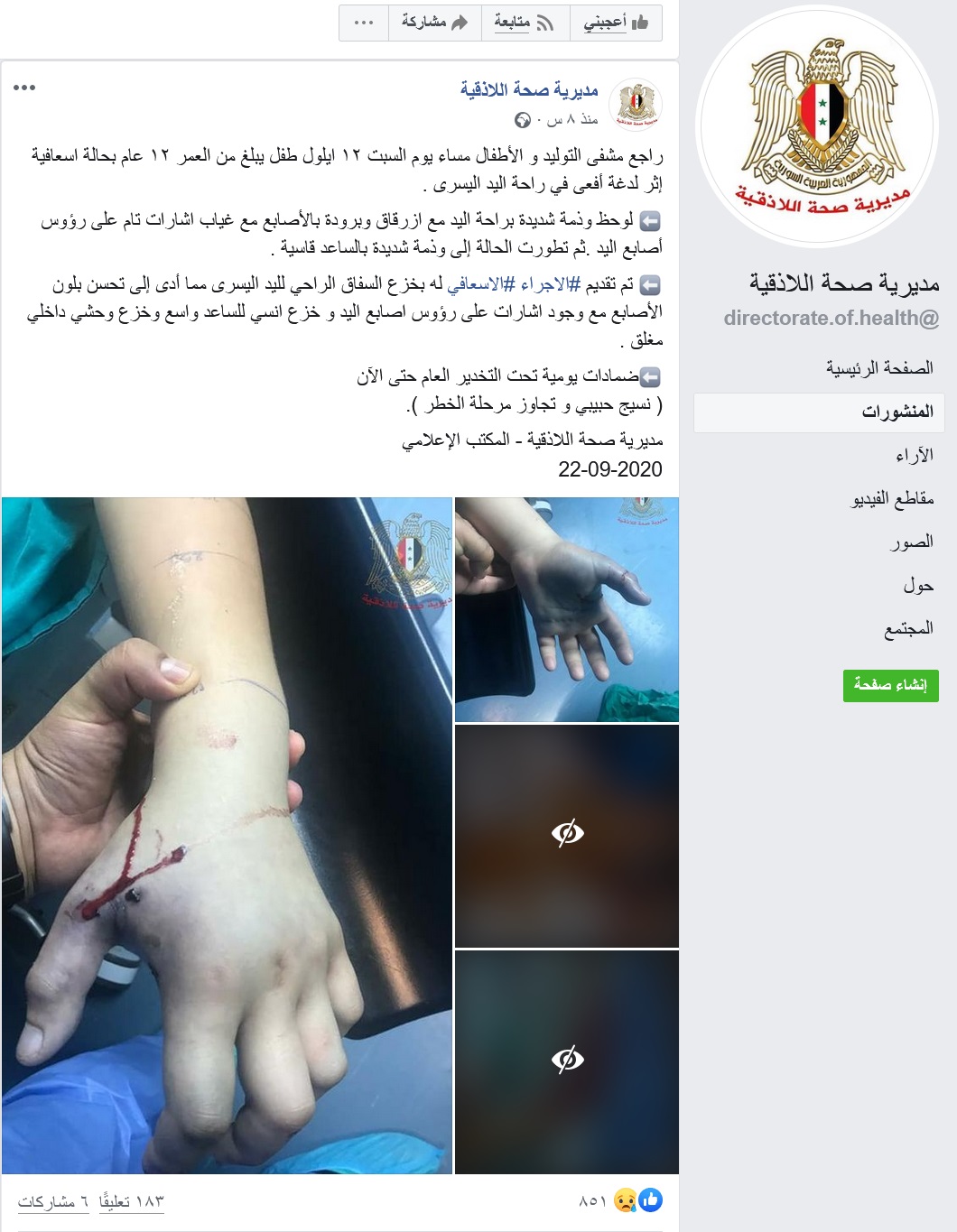 وقال الطبيب غدير حسون: ” بعد عضة الأفعى بنصف ساعة لوحظ وذمة شديدة براحة يد الطفل مع ازرقاق وبرودة بالأصابع مع غياب إشارات تام على رؤوس أصابع اليد، ثم تطورت الحالة إلى وذمة شديدة بالساعد”.
