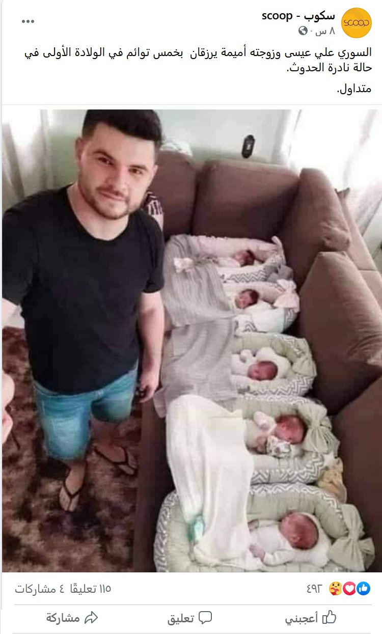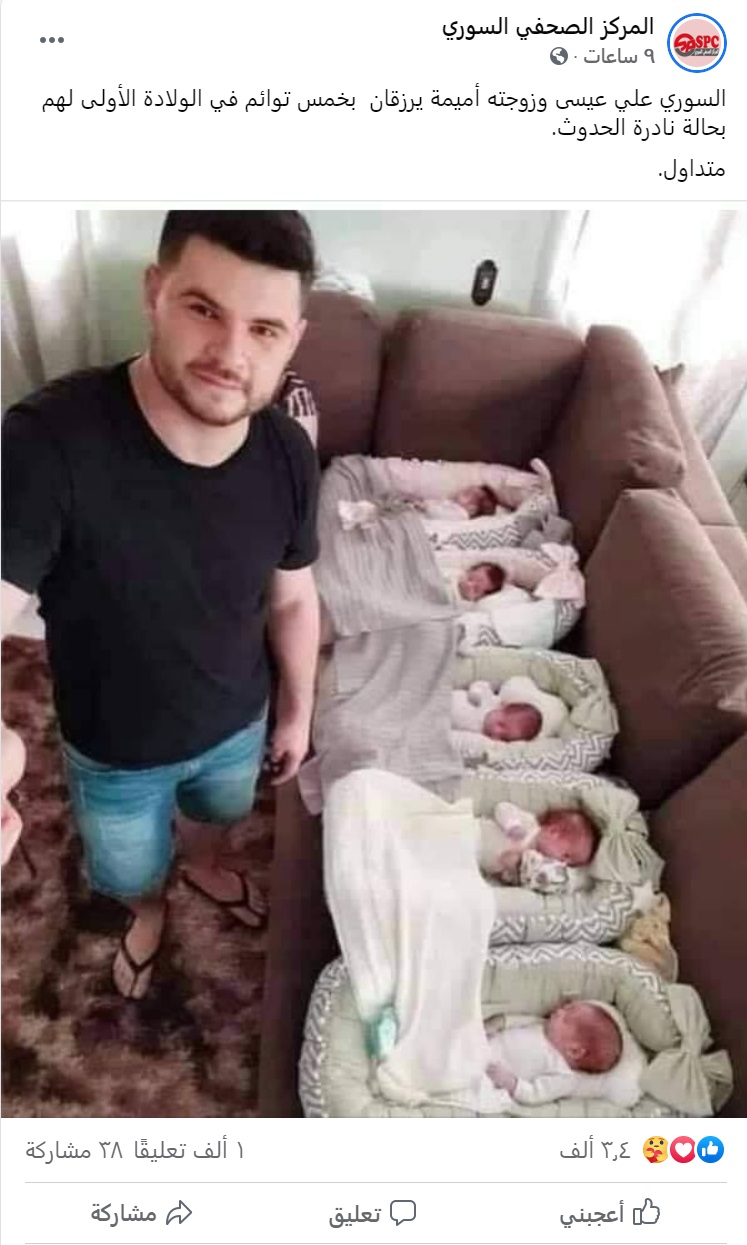وأرفق الناشرون الصورة بالقول إن “السوري علي عيسى وزوجته أميمة رزقان بخمس توائم في الولادة الأولى في حالة نادرة الحدوث”.