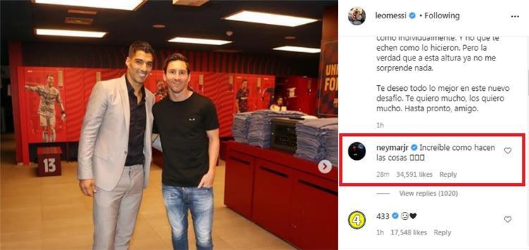 تفاعل النجم البرازيلي نيمار دا سيلفا، نجم باريس سان جيرمان الفرنسي، مع تصريحات زميله السابق، ليونيل ميسي قائد برشلونة، التي هاجم بها إدارة النادي الكتالوني، بسبب رحيل لويس سواريز.